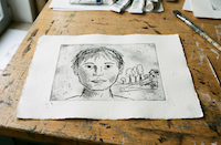 Mit spitzen Werkzeugen kratzen und schraffieren wir Bilder in Acrylglasplatten und drucken diese auf unserer großen Druckerpresse. Eine uralte Technik ganz neu interpretiert.